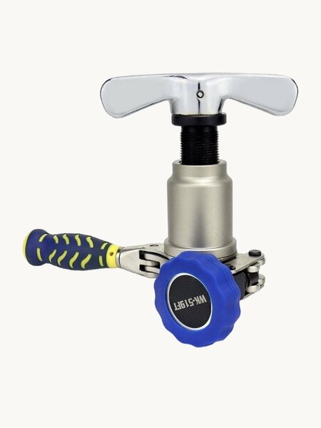 Развальцовка DSZH WK-519FT-L для медных, алюминиевых труб с ограничителем подачи трубы - это инструмент холодильщиков и монтажников по кондиционерам для изменения формы медных труб, их сгибания. Вальцовка для медной трубы модель WK-519FT-L- меняет геометрию с высоким радиусом для придания сгибу округлой формы для того, чтобы накрутить латунную гайку на 3-х ходовой порт кондиционера. Используйте вальцовку для медной трубы согласно диаметру. Для труб диаметром: 1/2", 1/4", 3/4", 3/8", 5/8", 5/16. Производитель: DSZH. Страна: Китай.