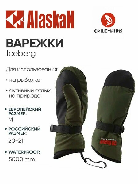 Варежки для зимней рыбалки и активного отдыха на природе, имеющие эргономичную форму, а также усиленный край лицевой части. На запястье регулировочная стропа на застежке-липучке «Велкро». Внутренняя часть варежек Alaskan Iceberg выполнена из искуственной кожи. Особенность данного материала в том, что он не даст варежке промокнуть, даже при условии, что вы берете рыбу в руки. Край варежки имеет фигурную форму и снабжен кулиской.