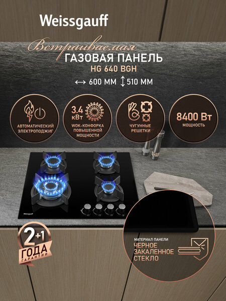 Встраиваемая независимая газовая панель Weissgauff шириной 60 см, исполненная в закалённом чёрном стекле - это стильное и компактное решение для вашей кухни! Ширина 60 см это европейский стандарт качества, признанный миллионами довольных покупателей по всему миру! Чёрное закаленное стекло не только роскошно выглядит, подчеркивая великолепный внешний вид данной модели, но и отлично справляется с механическими воздействиями и температурными перегрузками! Решетки из высококачественного чугуна это неизменное качество, надежность и долговечность, воплощенные в каждой детали! А особая элегантность их дизайна не только послужит отличным дополнением к общему стилю варочной панели, но и существенно облегчит очистку и уход за ней. А благодаря особому вниманию Weissgauff к каждой детали, вы еще не раз оцените устойчивость и эргономичность этих решеток! WOK-конфорка мощностью 3,4 кВт, которая создаёт сразу три кольца пламени и позволяет осуществить нагрев даже самой крупногабаритной посуды в кратчайший срок! Рукоятки Hi-Tech дополняют современный, по-немецки выверенный облик модели. Более того, конструктивные особенности строения и расположения этих рукояток защищают их от перегрева и деформации при длительном термическом воздействии в процессе приготовления еды! Автоматический электроподжиг, независимо встроенный в каждую из рукояток, позволит зажечь любую конфорку за долю секунды, всего одним нажатием и поворотом руки, не прибегая к дополнительным приспособлениям! Обращаем внимание, что точная ширина данной модели между наиболее выступающими её частями составляет 584 мм.