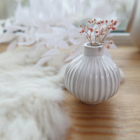 Ваза "Mini Poppy" от HIll & Mill - это стильный и функциональный элемент декора, который подойдет к большинству интерьеров. Обтекаемые линии и приятная неровность вазы, а также глянцевая поверхность, делают ее уникальной и выделяющейся среди других. Ваза "Mini Poppy" изготовлена из керамики, что гарантирует ее прочность и долговечность. Керамика также обеспечивает равномерное распределение тепла, что позволяет сохранять свежесть цветов на более длительное время. Ваза имеет круглую форму и белый цвет, что делает ее подходящей для размещения на столе или тумбе. Высота вазы составляет 9 см, а диаметр - 8 см, что позволяет разместить в ней различные композиции из сухоцветов и отдельных веточек. Ваза "Mini Poppy" - это не просто предмет интерьера, это способ выразить свою индивидуальность и создать уютную атмосферу в вашем доме.