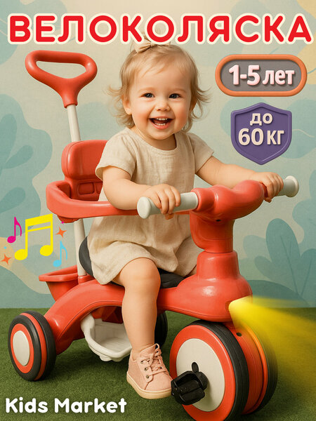 Велоколяска для детей c музыкой, велосипед детский трехколесный, беговел