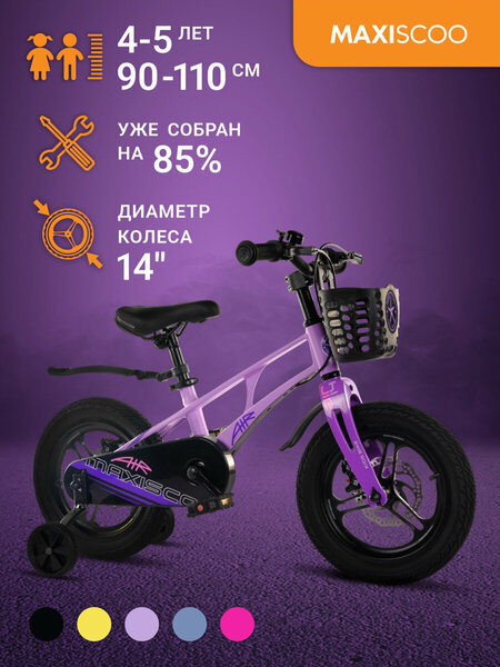 Детский двухколесный велосипед Maxiscoo AIR Pro 14" (2024) - это наша гордость. Красивый и легкий как воздух дизайн запатентованной рамы из магниевого сплава, с удобной посадкой не имеет аналогов на рынке. Внимание к деталям, надежность и качественные комплектующие - это то, что отличает данную модель велосипеда. Приятным бонусом будет быстросъемная фирменная корзина, которая так нравится детям. Размер колес: 14"; Рекомендованный рост: 90-110; Рекомендованный возраст: 4-5 лет; Высота руля: 65 см; Высота седла: 44-53,5 см; Процент сборки: 85%; Вес велосипеда: 8,5 кг; Корзинка, боковые колеса, крылья и звонок в комплекте; Полная защита цепи; Рама: магниевый сплав; Руль: алюминиевый; Рулевая колонка: безрезьбовая; Вилка: жесткая, магниевый сплав; Передний тормоз: дисковый механический; Задний тормоз: дисковый механический; Обод: магниевый сплав; Покрышки: резина; Задние звезды: резьбовые; Система шатунов: трехсоставная; Каретка: закрытого типа на промподшипниках; Втулки: магниевые на промах; Количество скоростей: 1; Гарантия: 12 месяцев - рама, 6 месяцев - навесное оборудование. Ключи для сборки входят в комплект.