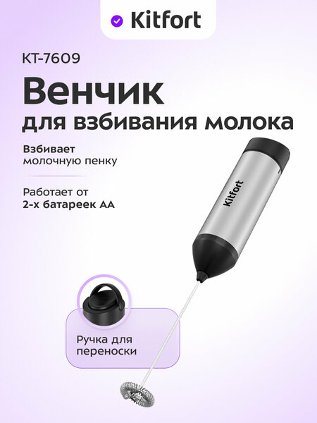 Для пышной молочной пенки Венчик для взбивания Kitfort КТ-7609 прекрасно взобьёт молочную пену для капучино, кофе латте и других напитков, а также без труда перемешает горячий шоколад или какао. Приготовление займёт не более 20 секунд. Выполнен из нержавеющей стали Благодаря венчику из нержавеющей стали можно взбивать горячее молоко, какао и другие напитки. Пружина достаточно жёсткая, что обеспечивает быстрое получение упругой пышной пенки. Управление в 1 нажатие У венчика КТ-7609 очень простое управление. Кнопка включения располагается на ручке. Прибор работает, пока вы удерживаете кнопку. Ручка для крепления На крышке отсека для батареек есть ручка. Её удобно использовать для переноски устройства, а также для того, чтобы повесить устройство на крючок при хранении. Беспроводная работа Венчик для взбивания молока работает от 2 батареек типоразмера АА, поэтому провода не будут мешаться во время работы. Их заряда хватит на долгое время эксплуатации. Батарейки в комплект не входят.