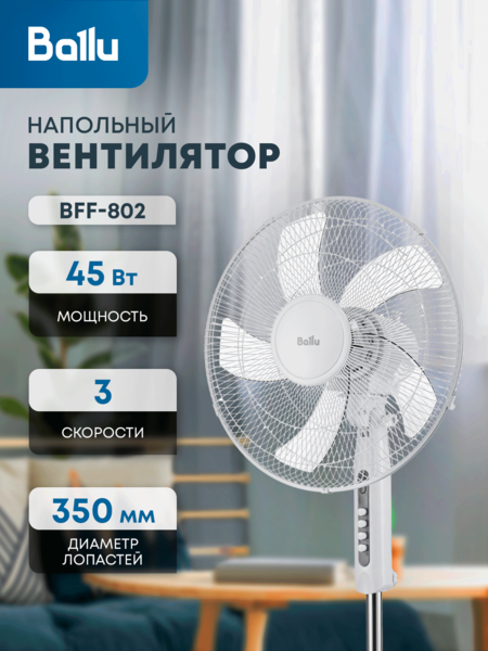 Вентилятор напольный Ballu BFF–802 — эффективный эргономичный прибор с интуитивно понятным управлением. Пять аэродинамичных лопастей быстро создают комфортный микроклимат в жаркий период. Вентилятор работает в трех разных режимах — вы легко сможете подобрать оптимальный. Кроме того, благодаря технологии SLEEP WELL лопасти вращаются почти бесшумно, поэтому прибор можно использовать даже в ночное время. Вентилятор отличается повышенной устойчивостью, что достигается за счет утяжеленного круглого основания.
