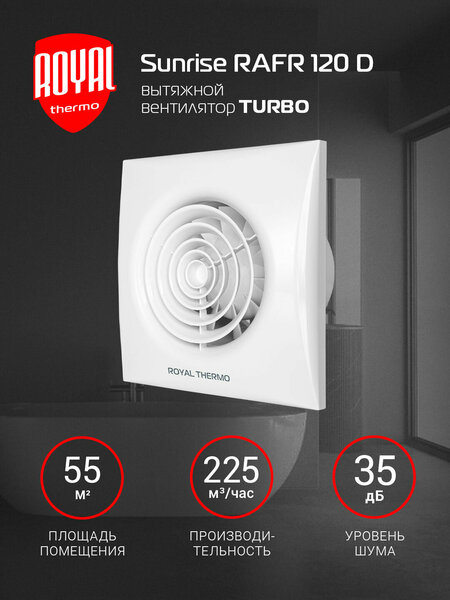 Вентилятор вытяжной Royal Thermo RAFR 120 D Turbo, 120 мм, с высокой производительностью, белый, для ванной и туалета