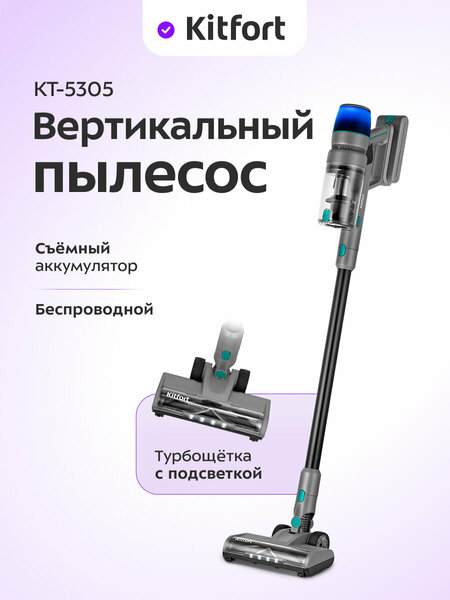 Удобен для уборки! Беспроводной вертикальный пылесос КТ-5305 очень удобен для проведения локальной и генеральной уборки. Он компактен, всегда под рукой и готов к работе. Благодаря работе от аккумулятора не нужно включать вилку в розетку, провода не мешают под ногами. Конструкция «2 в 1» Конструкция «2 в 1» предусматривает наличие ручного пылесоса, который удобно использовать отдельно. Ручным пылесосом можно пропылесосить углы и плинтусы, обивку мебели, пыль со шкафов, шкафчики на кухне или в гостиной, книжные полки, коврики в автомобиле. Напольная щётка с подсветкой Пылесос комплектуется напольной щёткой, которая помогает качественно справиться с очисткой гладких поверхностей и ковровых покрытий. Светодиодная подсветка напольной щётки сделает уборку комфортной даже в затемнённых местах. Насадки для уборки разных мест Насадка «2 в 1» состоит из ворсовой щётки и узкой насадки. Ворсовая щётка может для сбора мелкого сыпучего мусора с неровных поверхностей, узкая насадка удобна для чистки мягкой мебели. Щелевая насадка позволит очистить труднодоступные и узкие места. Надёжная фильтрация! Пылесос оборудован современным циклонным фильтром, обеспечивающим хорошую очистку. Крышка пылесборника легко открывается, а пыль из него вытряхивается очень просто. Внутри пылесборника находится фильтр тонкой очистки и фильтр грубой очистки. Интуитивно понятный дисплей У пылесоса есть дисплей, на котором отображается текущий уровень заряда батареи. Во всасывающее отверстие и турбощётку пылесоса встроены датчики, которые срабатывают, когда во всасывающее отверстие попадает крупный мусор или щётка перестаёт вращаться. Съёмный аккумулятор Аккумулятор пылесоса съёмный, поэтому вы можете заряжать его, когда он установлен на пылесос, или сняв аккумулятор с пылесоса. Это очень удобно, так как располагать кронштейн для хранения пылесоса можно в любом удобном месте даже без розетки рядом. Кронштейн в комплекте Пылесос рекомендуется устанавливать на кронштейн из комплекта, который крепится к стене. Для владельцев небольших квартир, которые сталкиваются с проблемой того, где хранить пылесос, приобретение этой модели будет оптимальным вариантом. Верный помощник в доме Одно из главных достоинств вертикального пылесоса – его компактность. Во время работы пылесос поможет легко убраться в узком коридоре или комнате. Пылесос хорошо подходит для оперативной уборки, например, рассыпанных крошек или песка от обуви в коридоре.