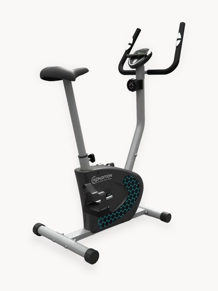 Достаточно компактный вертикальный тренажёр Kondition предназначен для поддержания физической формы и улучшения здоровья. Велотренажер оснащен инерционным маховиком весом 5 кг с возможностью крутить педали в обе стороны. Нагрузка осуществляется с помощью магнитной системы и регулируется механически на 8 уровней. Сиденье велотренажера регулируется по вертикали на 7 уровней, что позволяет настроить его под свой рост. Для отслеживания показаний во время тренировок, на поручнях велотренажера расположены сенсорные датчики пульса. Кроме того, велотренажер оснащен компенсаторами неровности пола, что позволяет стабильно использовать его на любой поверхности. Монохромный LCD дисплей Kondition отображает следующие показатели: скан, скорость, время, калории, пульс и расстояние. Для работы консоли требуются 2 батарейки типа ААА (входят в комплект).