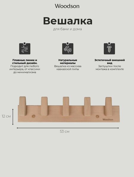 Вешалка Woodson D5 имеет 5 крючков, изготовлена вручную из дерева. Украсит интерьер бани, сауны и ванной комнаты. Удобная для халатов и полотенец. Длина 515 мм, высота 80 мм, глубина 20мм.