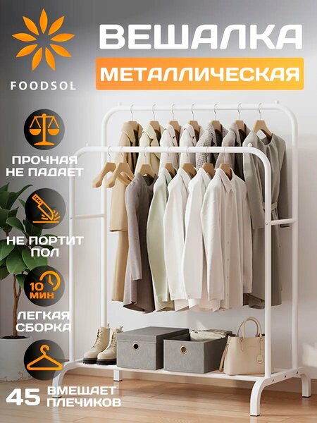 Напольная стойка для одежды металлическая — удобная вешалка для одежды напольная для хранения вещей в прихожей, гардеробной или спальне. Стойка для одежды помогает организовать хранение одежды и поддерживать порядок в доме. Металлическая стойка для одежды оснащена прочной конструкцией и подходит для верхней одежды, платьев, рубашек, костюмов и повседневных вещей. Напольная вешалка для одежды металлическая устойчива и рассчитана на ежедневную нагрузку. Белая вешалка для одежды напольная экономит пространство и подходит для квартиры, дома, офиса или гардеробной комнаты. Стойка для одежды напольная металлическая гармонично вписывается в интерьер. Вешалка напольная металлическая удобна для хранения длинной и короткой одежды. Напольная стойка для одежды подходит для прихожей и небольших помещений.