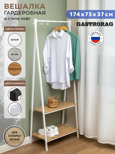 Предлагаем вашему вниманию напольную вешалку в стиле лофт от российского бренда Gastrorag. Этот предмет мебели идеально подходит для хранения одежды, обуви и аксессуаров (сумок, зонтов и прочего) дома, на даче и в офисе. Стоячее костюмное вешало прекрасно впишется в интерьер в стиле loft или минимализм, способствуя созданию уютной атмосферы в доме. Открытая гардеробная система для вещей может использоваться для организации пространства и наведения порядка в любом помещении вашей квартиры: в прихожей и коридоре, в гостиной, спальне и детской для ребенка, в сухой зоне ванной комнаты. Ее можно использовать и в офисных раздевалках, кафе и магазинах. Компактный и легкий многофункциональный стеллаж с легкостью заменит громоздкий шкаф и при этом потребует минимум пространства. Вы сможете разместить на нашей этажерке верхнюю одежду и значительную часть гардероба: пиджаки и брюки, костюмы и платья, различное белье. Она также находит применение в качестве стойки для отпаривания одежды. Каркас вешалки изготовлен из профильной стальной трубы сечением 20х20 мм с матовым порошково-полимерным покрытием. Толщина металла 1 мм. На ножках предусмотрены пластиковые заглушки, которые защищают напольное покрытие от царапин. Верхняя перекладина круглого сечения выдерживает нагрузку до 20 кг. Она вмещает до 15 плечиков, а боковины железного каркаса защищают их от соскальзывания на пол. С боков на рейле закреплены два прочных металлических крючка, на которые удобно вешать сумки, рюкзаки и зонтики. Высота перекладины не регулируется. В нижней части предусмотрены две большие полки. Их удобно использовать в качестве подставок для обуви и различных бытовых предметов в коробках и органайзерах. Материал полок – ЛДСП. Благодаря компактности и небольшому весу передвижную конструкцию при необходимости легко переместить с места на место. Вешалка поставляется в разобранном виде. Удобная упаковка с ручкой позволяет легко донести покупку из пункта выдачи до дома. В комплект входит вся необходимая фурнитура и инструкция по сборке и эксплуатации.