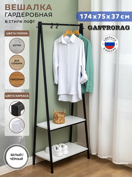 Предлагаем вашему вниманию напольную вешалку в стиле лофт от российского бренда Gastrorag. Этот предмет мебели идеально подходит для хранения одежды, обуви и аксессуаров (сумок, зонтов и прочего) дома, на даче и в офисе. Стоячее костюмное вешало прекрасно впишется в интерьер в стиле loft или минимализм, способствуя созданию уютной атмосферы в доме. Открытая гардеробная система для вещей может использоваться для организации пространства и наведения порядка в любом помещении вашей квартиры: в прихожей и коридоре, в гостиной, спальне и детской для ребенка, в сухой зоне ванной комнаты. Ее можно использовать и в офисных раздевалках, кафе и магазинах. Компактный и легкий многофункциональный стеллаж с легкостью заменит громоздкий шкаф и при этом потребует минимум пространства. Вы сможете разместить на нашей этажерке верхнюю одежду и значительную часть гардероба: пиджаки и брюки, костюмы и платья, различное белье. Она также находит применение в качестве стойки для отпаривания одежды. Каркас вешалки изготовлен из профильной стальной трубы сечением 20х20 мм с матовым порошково-полимерным покрытием. Толщина металла 1 мм. На ножках предусмотрены пластиковые заглушки, которые защищают напольное покрытие от царапин. Верхняя перекладина круглого сечения выдерживает нагрузку до 20 кг. Она вмещает до 15 плечиков, а боковины железного каркаса защищают их от соскальзывания на пол. С боков на рейле закреплены два прочных металлических крючка, на которые удобно вешать сумки, рюкзаки и зонтики. Высота перекладины не регулируется. В нижней части предусмотрены две большие полки. Их удобно использовать в качестве подставок для обуви и различных бытовых предметов в коробках и органайзерах. Материал полок – ЛДСП. Благодаря компактности и небольшому весу передвижную конструкцию при необходимости легко переместить с места на место. Вешалка поставляется в разобранном виде. Удобная упаковка с ручкой позволяет легко донести покупку из пункта выдачи до дома. В комплект входит вся необходимая фурнитура и инструкция по сборке и эксплуатации.