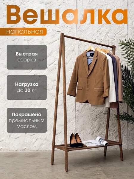 Эта напольная деревянная стойка с рейлом и полкой станет практичным решением для организации пространства в прихожей, коридоре или гардеробной. Благодаря своей конструкции, она объединяет функции шкафа и вешалки, позволяя аккуратно разместить верхнюю одежду, аксессуары и другую одежду. Мебель идеально впишется в домашний интерьер, создавая атмосферу уюта и порядка. Использование древесины в изделии придает ему натуральный и теплый вид, который сохраняет стиль лофт и поддерживает гармонию с остальной обстановкой в доме. Напольная система хранит все необходимое в зоне прихожей, облегчая повседневное использование одежды и упрощая процесс ее выбора. Стойка оснащена штангой, на которой удобно развешивать вещи, а полка предоставляет дополнительное пространство для обувницы или хранения других предметов. Практичность мебели усиливается благодаря небольшим колесикам, которые позволяют легко перемещать конструкцию в пределах прихожей или коридора, подстраивая организацию гардеробной под свои нужды. Такой комплект способствует эффективному использованию площади и хранению всего необходимого на виду. Размещение вещей на открытом рейле упрощает доступ и поддерживает порядок без лишних усилий. Наличие полки для обуви или аксессуаров помогает держать прихожую аккуратной и функциональной, что повышает удобство в домашнем использовании. Модель также отлично сочетается с мебелью в стиле икеа, благодаря универсальному дизайну и натуральным материалам. Выбирая эту систему, вы получаете не просто вешалку, а компактный стеллаж для одежды, который служит полноценным помощником в организации домашнего пространства. Он создает удобство для хранения верхней одежды, обуви и других предметов, необходимых для выхода из дома и возвращения в него. Таким образом, данный напольный шкаф с рейлом и полкой станет незаменимым элементом в прихожей, гардеробной или коридоре, сочетая в себе функциональность, удобство и стиль деревянной мебели. Его использование поддерживает порядок, облегчает ежедневное использование вещей и помогает поддерживать уют в доме.
