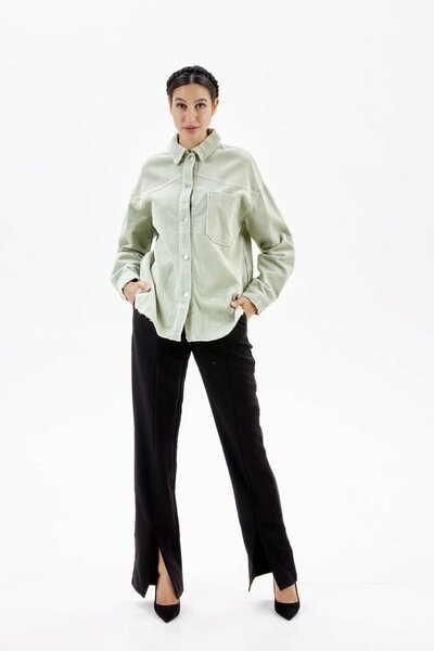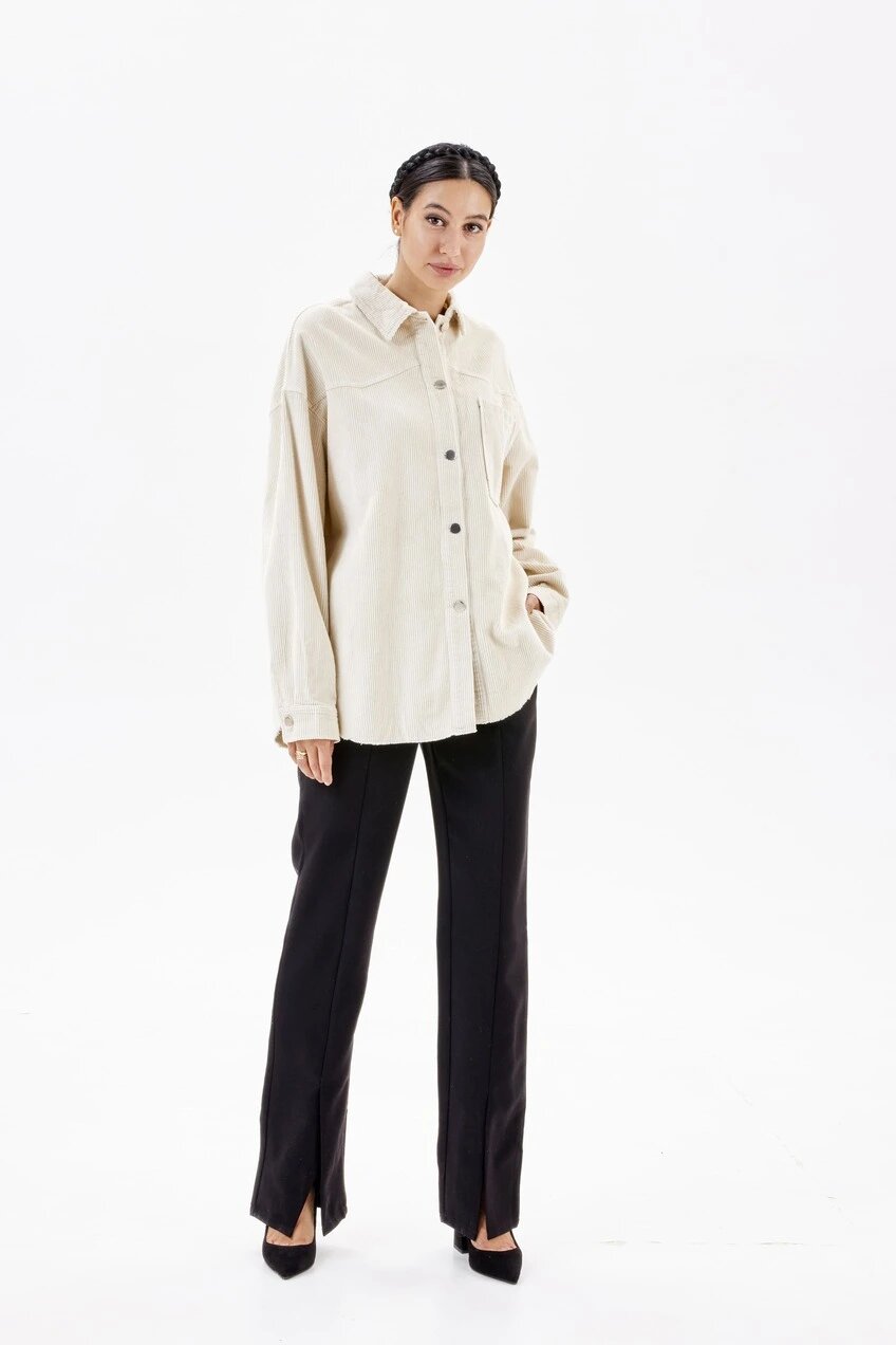 Рубашка прямого кроя, выполненная из плотного твила. Модель имеет длинные рукава, накладной карман и застежку на блестящие металлические пуговицы. Носите как самостоятельно, так и комбинируйте в многослойных образах.