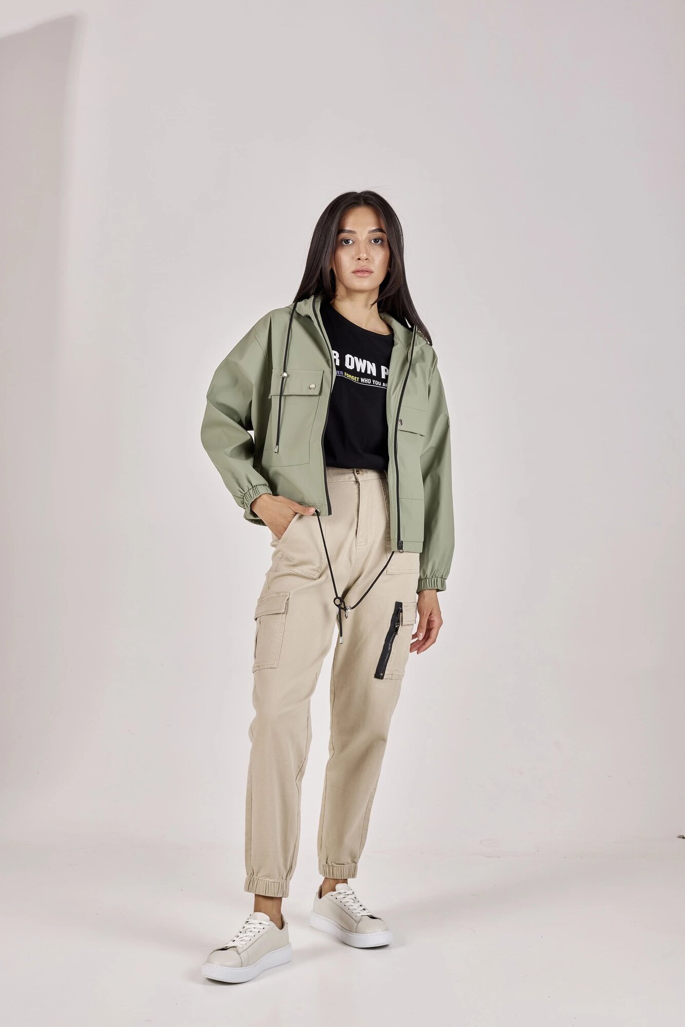 Стильная укороченная ветровка с контрастной застежкой и шнурками, выполнена из качественной экокожи. Свободный крой, высокий ворот и спущенные рукава придают комфорт. Универсальное решение для активного отдыха и прогулок. Отлично смотрится с кюлотами, брюками-карго, спортивными брюками, велосипедками.
