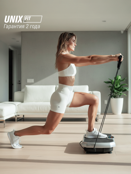 Ищете способ без мучений улучшить физическую форму, сжечь калории и укрепить мышцы? Виброплатформа UNIX Fit 2D вибро тренажер для похудения и пресса, тренажер для фитнеса, для дома (горизонтальные колебания 4-12 Гц) для вас! Преимущества виброплатформы: 1. Эффективные тренировки: Вибрации активируют до 90% мышц, что позволяет достигать результатов быстрее, чем при классических упражнениях. 2 эспандера в комплекте для дополнительной нагрузки на руки. 2. Удобство использования: Компактный и стильный дизайн позволяет легко разместить вибро тренажер в любом уголке вашего дома. Подходит для использования как новичками, так и опытными спортсменами. 3. Многофункциональность: Платформа предлагает различные режимы вибрации и интенсивности, а также 3 ручных и 5 предустановленных программ, что позволяет адаптировать тренировки под ваши цели — от похудения до укрепления мышц. Таймер на 10 минут поможет контролировать ваши тренировки. 4. Улучшение кровообращения: Регулярные занятия на вибротренажере способствуют улучшению циркуляции крови, что положительно сказывается на общем состоянии здоровья, а также помогает прокачать мышцы ног, бедер и пресса. Эспандеры позволяют задействовать мышцы рук во время занятий на виброплатформе для фитнеса. 5. Снижение нагрузки на суставы: Вибрации уменьшают ударную нагрузку на суставы, что делает тренировки безопасными даже для людей с проблемами опорно-двигательного аппарата. Максимальный вес пользователя 150 кг. 6. Легкость в использовании: Пульт управления и делает использование платформы простым и удобным. Вы можете менять режимы прямо во время тренировки и отслеживать установленные программы на ЖК дисплее. Тренажером также можно управлять с встроенной панели управления. Возможность подключения по bluetooth. 7. Компактность и мобильность: Легкая конструкция позволяет легко перемещать домашний тренажер и хранить его даже в небольших помещениях. Высота платформы всего 12 см - это позволит хранить ее даже под диваном. 8. Режимы работы: - Режим ожидания: Виброплатформа включена, но программа еще не выбрана. - Автоматический режим: Выберите одну из 5 встроенных программ тренировок. Каждая программа имеет низкую, среднюю или высокую скорость вибрации. - Ручной режим: Установите собственную продолжительность тренировки и скорость вибрации. 9. Удобный пульт дистанционного управления. Вы сможете установить время тренировки, выбрать нужную вам программу или выставить нужную скорость. Данные будут отображаться на ЖК экране. С пульта можно управлять воспроизведением музыки или громкостью через bluetooth. 10. Противоскользящее покрытие. Резиновый слой на рабочей поверхности не дает проскальзывать по нему кроссовкам. 11. Выбор уровня скорости вибрации от 1 до 180. Для тренировок доступно три режима сложности: от начинающего до продвинутого. Также вы можете настроить прибор самостоятельно, выбрав одну из 180 скоростей вибрации. За выставленной программой просто следить через дисплей, расположенный на корпусе.