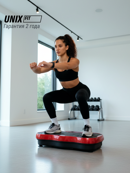 Ищете способ без мучений улучшить физическую форму, сжечь калории и укрепить мышцы? Виброплатформа UNIX Fit интенсивная / Intensive 2D вибро тренажер для похудения и пресса, тренажер для фитнеса, для дома (горизонтальные колебания 1-15 Гц) для вас! Виброплатформа UNIX Fit Intensive 2D – незаменимый помощник в борьбе за красивую фигуру и хорошее самочувствие. Эта многофункциональная виброплатформа подойдет тем, кто ценит свое время, стремится к физическому здоровью и красоте. Она поможет Вам в короткие сроки привести свое тело в порядок, укрепить мышцы, избавиться от лишнего веса и целлюлита без переутомления и чрезмерных нагрузок, сэкономив Ваше время и деньги на посещении фитнес центров и массажных салонов. Виброплатформа - это удобный инструмент, сочетающий в себе функции массажера и тренажера, который задействует практически все группы мышц и позволяет эффективно бороться с негативными последствиями малоподвижного образа жизни, восстановить правильное кровообращение и продлить молодость организма. Вы также можете использовать данную виброплатформу в качестве степ платформы, а комплект из двух эластичных эспандеров, крепящихся к основанию виброплатформы, дает возможность держать в тонусе плечи, мышцы рук, талии, ягодиц, бедер и икр. Вечерние упражнения на виброплатформе помогут снять усталость и напряжение после рабочего дня. Принцип действия виброплатформы основан на рефлекторном ответе мышц на совершаемые виброплатформой вертикальные вибрационные колебания. За счет вибрации происходит непроизвольное сокращение множества мышц для стабилизации тела — они сокращаются и расслабляются до 50 раз за секунду, что значительно повышает эффективность и интенсивность тренировок. Ставя ноги в различные позиции по отношению к центру виброплатформы, Вы сможете имитировать ходьбу, бег трусцой и бег, оставаясь при этом дома. Для пользователей с начальным уровнем подготовки рекомендуется использовать виброплатформу в течение 10 минут 3 дня в неделю. Занятия на виброплатформе помогут Вам: • Быстрее похудеть • Избавиться от лишнего веса • Привести в тонус и укрепить мышцы • Укрепить кости • Улучшить работу пищеварительной системы • Снять мышечное напряжение • Улучшить качество сна и отдыха • Контролировать уровень холестерина • Повысить физическую выносливость • Ослабить депрессию, снизить уровень стресса, бессонницы Преимущества виброплатформы: 1. Эффективные тренировки: Вибрации активируют до 90% мышц, что позволяет достигать результатов быстрее, чем при классических упражнениях. 2 эспандера в комплекте для дополнительной нагрузки на руки. 2. Удобство использования: Компактный и стильный дизайн позволяет легко разместить вибро тренажер в любом уголке вашего дома. Подходит для использования как новичками, так и опытными спортсменами. 3. Многофункциональность: Платформа предлагает различные режимы вибрации и интенсивности, а также 9 предустановленных программ, что позволяет адаптировать тренировки под ваши цели — от похудения до укрепления мышц. Таймер на 10 минут поможет контролировать ваши тренировки. 4. Улучшение кровообращения: Регулярные занятия на вибротренажере способствуют улучшению циркуляции крови, что положительно сказывается на общем состоянии здоровья, а также помогает прокачать мышцы ног, бедер и пресса. Возможно
