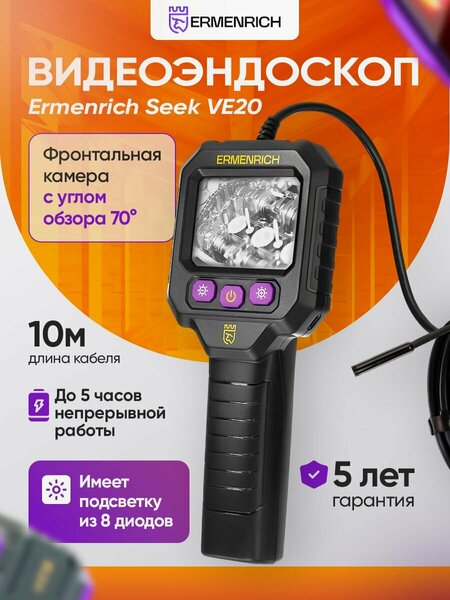 Видеоэндоскоп Ermenrich Seek VE20 позволяет осматривать труднодоступные места конструкций и техники, например, при ремонте трубопроводов или стеновых конструкций, обслуживании автомобилей, бытовой и промышленной техники и многих других задачах. Камера диаметром 8 мм расположена на конце гибкого кабеля длиной 10 метров. Для работы в темноте камера имеет подсветку из 8 светодиодов. Угол обзора – 70°. Камера защищена от попадания внутрь пыли и влаги при кратковременном погружении в воду. Изображение передается в режиме реального времени на цветной TFT-экран. Диагональ экрана 2,8", разрешение – 1280x720 пикс. Для питания прибора используется литий-ионный аккумулятор емкостью 2600 мАч. Полного заряда хватает на 5 часов непрерывной работы видеоэндоскопа. Заряжается батарея с помощью обычного кабеля USB Type-C и адаптера (не входит в комплект). Основные особенности: