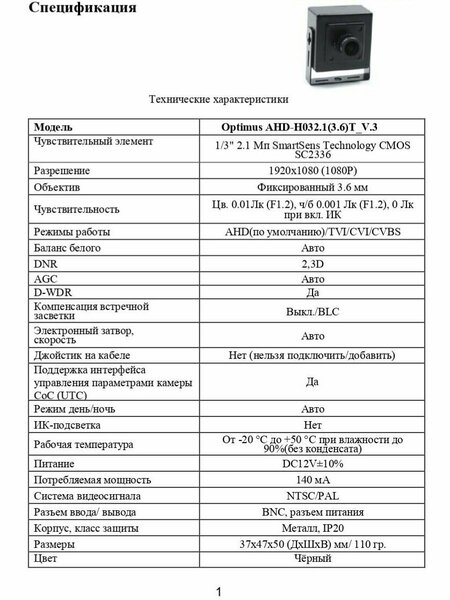 В основе камеры Optimus AHD-H032.1(3.6)T_V.3 лежит чувствительный элемент SmartSens Technology CMOS SC2336 диагональю 1/3" и разрешением 2.1 Мп. Камера позволяет получать качественное изображение высокого разрешения 1920х1080 пикселей. Модель оборудована фиксированным объективом 3.6 мм. Чувствительность камеры цв. 0.01Лк (F1.2), ч/б 0.001 Лк (F1.2), 0 Лк при вкл. ИК При работе доступны функции настройки автоматического баланса белого, 2D и 3D DNR. Питание камеры - DC12V±10%. Температурный режим: от -20 °С до +50 °С при влажности до 90%(без конденсата) Чувствительный элемент 1/3" 2.1 Мп SmartSens Technology CMOS SC2336 Объектив Фиксированный 3.6 мм Чувствительность Цв. 0.01Лк (F1.2), ч/б 0.001 Лк (F1.2), 0 Лк при вкл. ИК Система видеосигнала NTSC/PAL Потребляемая мощность 140 мА Режимы работы AHD(по умолчанию)/TVI/CVI/CVBS Цвет Чёрный Режим день/ночь Авто Масса 110 г DNR 2D, 3D Электронный затвор, скорость Авто Разъем ввода/ вывода BNC, разъем питания D-WDR Да Компенсация встречной засветки Выкл./BLC Подсветка Нет Корпус, класс защиты Металл, IP20 Баланс белого Авто AGC Авто Рабочая температура От -20 °С до +50 °С при влажности до 90%(без конденсата) Питание DC12V±10% Размеры 37x47x50мм Разрешение 1920х1080 (1080P) Поддержка интерфейса управления параметрами камеры CoC (UTC) Да Джойстик на кабеле (OSD) Нет (нельзя подключить/добавить)