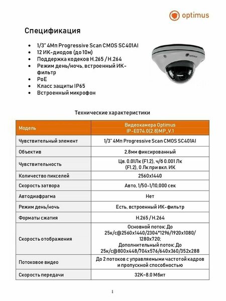 Купольная IP-видеокамера Optimus IP-E074.0(2.8)MP_V.1 создана на основе 1/3” Progressive Scan CMOS SC401AI, разрешением 4 Мп. Оборудована фиксированный 2,8 мм объективом, встроенным ИК-фильтром. Светочувствительность камеры составляет цв. 0.01Лк (F1.2), ч/б 0.001 Лк (F1.2), 0 Лк при вкл. ИК. Работу в ночное время обеспечивают 12 ИК-диодов с максимальной дальностью 10 м. Позволяет передавать 2 видеопотока с управляемой частотой кадров и пропускной способностью, форматы сжатия видео H.265 / H.264. Камера выполнена в металлическом корпусе степенью защиты IP65. Рабочая температура от -45° С до +50° С. Чувствительный элемент 1/3” 4Мп Progressive Scan CMOS SC401AI Объектив 2.8 мм фиксированный Чувствительность Цв. 0.01Лк (F1.2), ч/б 0.001 Лк (F1.2), 0 Лк при вкл. ИК Скорость передачи 32K~8.0 Мбит Количество пикселей 2560х1440 Скорость затвора Авто, 1/50-1/10,000 сек Автодиафрагма Нет Режим день/ночь Есть, встроенный ИК-фильтр Форматы сжатия H.265 / H.264 Скорость отображения Основной поток: До 25к/с@2560x1440/2304*1296/1920х1080/1280x720; Дополнительный поток: До 25к/с@800x448/704х576/640x360/352х288 Потоковое видео До 2 потоков с управляемыми частотой кадров и пропускной способностью Настройки изображения Яркость, Контрастность, Насыщенность, Затвор, DWDR, Режим День/Ночь, 3D и 2D DNR Аудио сжатие G.711A Сетевой протокол TCP, UDP, IP, HTTP, FTP, SMTP, DHCP, DNS, ARP, ICMP, NTP, RTP, RTCP, PPPoE Интерфейс приложений Onvif 21.06 Интеллектуальные функции Определение движения, Определение людей Сигнал на тревожном выходе Нет Фиксация событий Снимок экрана, Отправка на E-mail Конфигурация Web интерфейс, Optimus Connect VMS Браузер MS Internet Explorer, Opera, Mozilla, Firefox, Safari, Chrome Облачный сервис P2P Optimus Connect , XMeye , IPeye Встроенное устройство записи Нет Процессор и Память GK7205V500 Разъемы ввода / вывода RJ45, разъем питания Питание через Ethernet PoE IEEE 802.3af до 6Вт Масса 360 г DWDR Да Подсветка 12 ИК диодов, дальность до 10м Корпус, класс защиты Класс защиты IР65 Рабочая температура От -45°С до +50°С Питание DC12В(500мА), PoE мах 6Вт Размеры 120х120х80 мм Безопасность Защита по паролю Видео выход Нет Встроенный микрофон Да