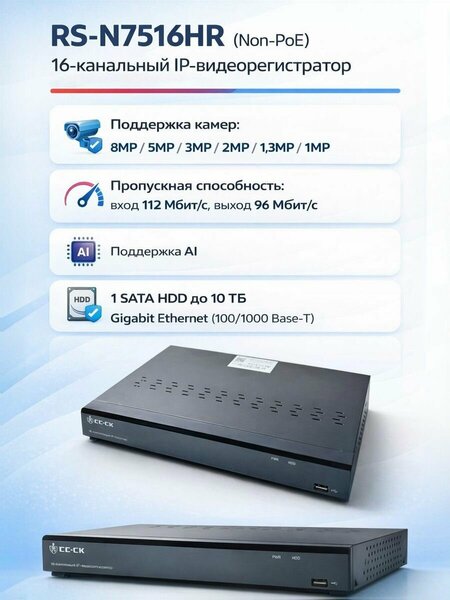 IP-видеорегистратор СС-СК RS-N7516HR (Non-PoE) предназначен для построения систем видеонаблюдения до 16 каналов. Поддерживает запись с IP-камер разрешением 8MP, 5MP, 3MP, 2MP (1080P), 1.3MP (960P) и 1.0MP (720P) с пропускной способностью входящего потока до 112 Мбит/с. Совместим с кодеками H.264/H.264+, H.265/H.265+, что позволяет оптимизировать хранение архива. Регистратор оснащён HDMI и VGA выходами с поддержкой разрешения до 3840×2160, гигабитным портом RJ45 10/100/1000 Base-T и двумя USB 2.0. Предусмотрена установка одного SATA HDD объёмом до 10 ТБ. Поддерживаются детекция движения (уровни 1–8), уведомления по Email и push-оповещения в приложении Rxcamview. Подходит для офисов, магазинов, складов и других объектов, где требуется стабильная запись и удобный удалённый доступ через веб-интерфейс или мобильное приложение.