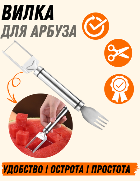 Q1: Для каких фруктов подходит эта вилка? A1: Она универсальна: подходит для арбуза, дыни, манго, киви и других фруктов. Q2: Можно ли мыть вилку в посудомоечной машине? A2: Да, изделие выполнено из нержавейки и устойчиво к мытью в посудомойке. Q3: Как работает функция 2 в 1? A3: Сначала вилка используется как нож для нарезки арбуза кубиками, затем как столовый прибор для подачи. Q4: Из какого материала сделан прибор? A4: Из пищевой нержавеющей стали с антикоррозийной обработкой. Q5: Подходит ли вилка для поездок на природу? A5: Да, благодаря компактному и лёгкому дизайну её удобно брать на дачу или в поход.