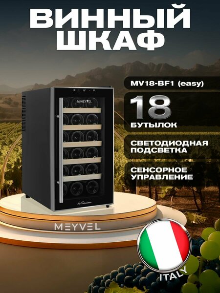 Термоэлектрический винный шкаф Meyvel MV18-BF1 Инженеры компании Meyvel разработали новую модель отдельностоящего винного шкафа MV18-BF1 (easy). Модель идеально вписывается в любой подходящий для Вас интерьер гостиной кухни, бара или кабинета. Двойное стекло с защитой от прямых УФ-лучей поддерживает качественные условия хранения вина. Термоэлектрический винный шкаф Meyvel MV18-BF1 (easy) обладает средней вместимостью и способен разместить в себе до 18 бутылок. Располагаются они на полках из массива бука. Внутреннее пространство шкафа имеет одну температурную зону с возможностью настраивать её в диапазоне от +10 °C до +18°C. Электронный термостат помогает стабильно поддерживать заданную Вами температуру. Холодильник поддерживает влажность в диапазоне 60-80%, как в настоящем винном погребе. Лаконичный дизайн шкафа придаёт интерьеру современный вид. В модели MV18-BF1 (easy) использовано LED освещение, которое обеспечивает подсветку полок. Удобное и понятное сенсорное управление, исключает вероятность случайного нажатия. Дополнительно у данной модели шкафа предусмотрен демонстрационный режим, во время которого освещение не гаснет. Такая функция помогает демонстрировать винную коллекцию Вашим друзьям и близким. Винный шкаф MV18-BF1 (easy) – современное решение в вопросе хранения вин. Отличительные особенности Элегантный дизайн Тонированное стекло с УФ-фильтром Светодиодное освещение Класс энергоэффективности B Сенсорное управление Память настроек Демонстрационный режим Meyvel оставляет за собой право изменять параметры без предварительного уведомления. Термоэлектрический винный шкаф Meyvel MV18-BF1 (easy) Инженеры компании Meyvel разработали новую модель отдельностоящего винного шкафа MV18-BF1 (easy). Модель идеально вписывается в любой подходящий для Вас интерьер гостиной кухни, бара или кабинета. Двойное стекло с защитой от прямых УФ-лучей поддерживает качественные условия хранения вина. Для размещения винных бутылок, шкаф оснащен пятью полками из массива бука. Термоэлектрический винный шкаф имеет две температурные зоны, храните красные, белые и игристые вина! Данная модель поддерживает необходимый для хранения вин уровень влажности в 60-80%. Лаконичный дизайн шкафа придаёт интерьеру современный вид. В модели MV18-BF1 (easy) использовано LED освещение, которое обеспечивает подсветку полок. Современное сенсорное управление, исключает вероятность случайного нажатия. Дополнительно у данной модели шкафа предусмотрен демонстрационный режим, во время которого освещение не гаснет. Такая функция помогает демонстрировать винную коллекцию Вашим друзьям и близким. Винный шкаф MV18-BF1 (easy) – современное решение в вопросе хранения вин. Преимущества винного шкафа MV18-BF1 (easy): вместительность до 18 бутылок типа Бордо (0, 75л); Две температурные зоны; изысканный дизайн; равномерное охлаждение и качественная циркуляция воздуха; защита от УФ-излучения с помощью двойного стекла; мягкая светодиодная подсветка; современное сенсорное управление; простая система настройки уровня температуры; автоматическое размораживание; диапазон допустимых значений уровня влажности 60-80%; Приобретенный Вами винный шкаф MV18-BF1 (easy) полностью готов к эксплуатации. При возникновении вопросов, Вы можете обратиться в сервисный центр. Важно: прежде чем устанавливать винный шкаф, ознакомьтесь с указанными в инструкции пока