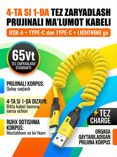 мощность 65W: Поддерживает стандарты быстрой зарядки Power Delivery. Способен заряжать не только смартфоны, но и планшеты с ноутбуками (в режиме Type-C to Type-C). спиральный дизайн (пружина): Благодаря форме пружины кабель никогда не запутывается, занимает минимум места, но при необходимости легко растягивается до нужной длины. цинковый сплав: Корпуса коннекторов выполнены из прочного цинкового сплава, что обеспечивает защиту от перегрева и премиальный внешний вид. передача данных: Стабильная и быстрая синхронизация файлов между устройствами. технические характеристики: — Тип: Спиральный дата-кабель 4-в-1 — Мощность: до 65 Вт — Интерфейсы: USB-A/Type-C -> Type-C/Lightning — Особенности: Не путается, металлические коннекторы — Цвет: Желтый