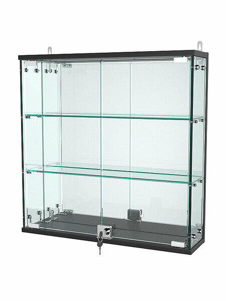 Данная модель включает две стеклянные полки и распашные дверки, закрывающиеся на ключ. Отличительная деталь - зеркальная задняя панель, позволяющая рассмотреть товар со всех сторон.
