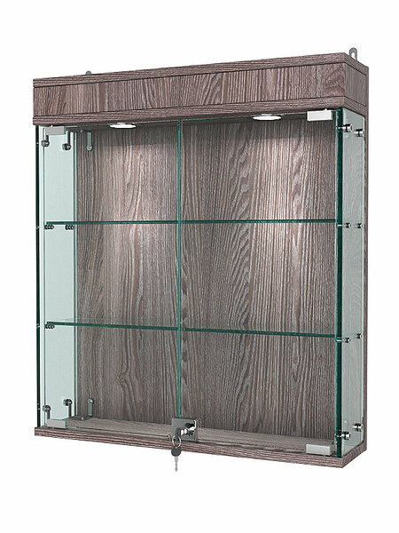 Данная модель включает две стеклянные полки и распашные дверки, закрывающиеся на ключ. Верхняя подсветка делает витрину ярче, а ее содержимое - заметнее.