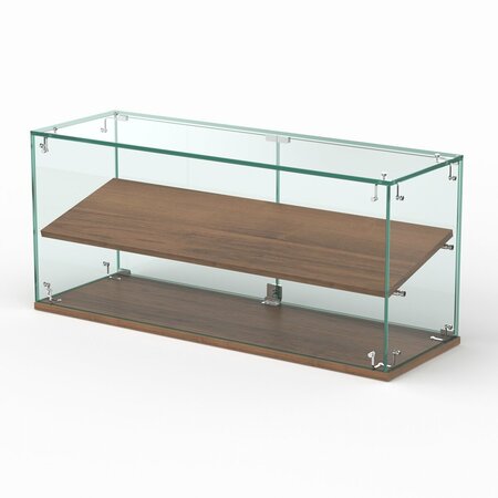 Витрина полностью стеклянная. Внутри располагается одна наклонная полка. Доступ к содержимому обеспечивают распашные дверки, расположенные со стороны продавца.