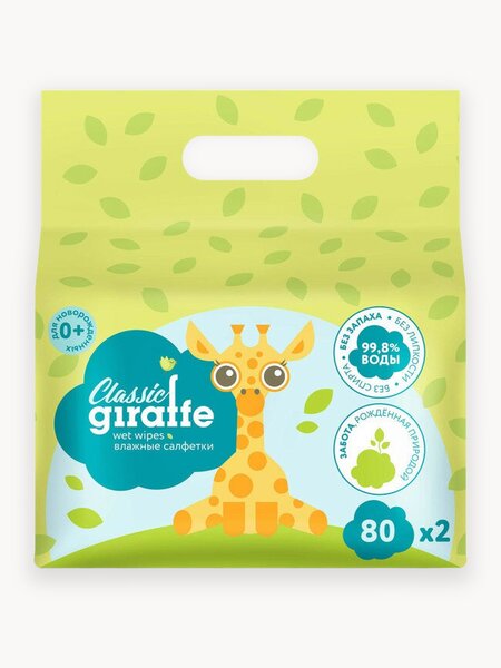 Влажные салфетки LOVULAR Giraffe, 2 шт, 80шт в упак, для чувствительной кожи, без отдушки