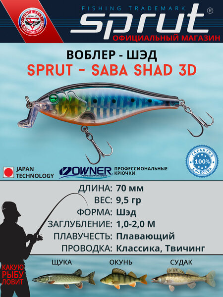 Воблер Sprut Saba Shad 3D Floating/70mm/9,5g/1-2m/SRD-3D