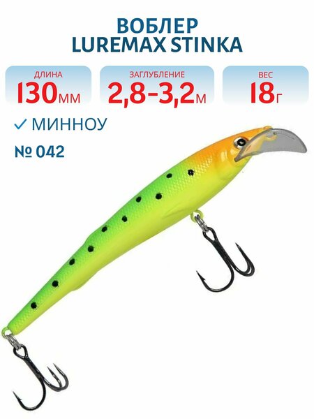 Воблер с седловидной лопаткой специально разработан для троллинга судака, озерной кумжи и лосося. Благодаря форме носовой лопасти и специальной балансировке, Stinka при проводке время от времени совершает броски в сторону, что провоцирует лососевых рыб на поклевку. Воблер «тихий» и не настораживает рыбу стуком металлических шариков, что бывает особенно важно при ловле осторожной рыбы. Приманка продемонстрировала хорошие результаты на водоемах Северо-Запада России. Приманка оснащена крючками Saikyo (Япония).