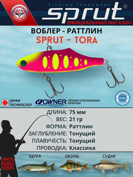 Быстротонущий раттлин с яркой, активной игрой. Его вес и обтекаемые пропорции позволяют выполнять сверхдальние забросы для облова больших, открытых акваторий. TORA можно применять в самых разнообразных условиях, например, при ловле на бровках и в ямах, регулируя паузами горизонт проводки, а также для ловли в отвес. Основным объектом охоты является крупный окунь, щука и судак.