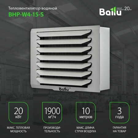 Ballu BHP-W4-15-S — водяной тепловентилятор промышленного класса для быстрого и экономичного обогрева складов, цехов, автомоек, гаражей, магазинов и производственных зон. Подключается к существующей системе отопления, поддерживает вентиляцию без нагрева и создает направленный поток до 10 м, что ускоряет прогрев рабочих площадей и снижает энергозатраты по сравнению с электрическими пушками. Тепловая мощность 20.3 кВт и расход воздуха 1900 м³/ч обеспечивают стабильный обогрев даже при интенсивной эксплуатации. Три скорости вентилятора и проводное управление позволяют точно настраивать микроклимат под задачу смены. Стандартные подключения 3/4, рабочие параметры теплоносителя до 120 °C и 16 бар, класс защиты IP54 для пыльных и влажных помещений. Питание вентилятора 220–240 В при токе до 0.45 А, потребляемая мощность всего 100 Вт. Удобный монтаж на универсальный кронштейн — настенный или потолочный, компактные габариты 535×420×305 мм и вес 12.3 кг облегчают установку и сервис. Ищете водяной тепловентилятор для цеха или склада — выбирайте Ballu BHP-W4-15-S. Это промышленный тепловентилятор с настенным или потолочным монтажом, отопление от котла без перегрева и запахов, надежный обогрев большой площади, промышленный обогреватель воздуха для производства и автомойки, эффективное отопление помещений с высокой влажностью и пылью. Гарантийный срок: 3 года; Нагрев воздуха (дельта температуры): 29 °С; Макс. тепловая мощность: 20.3 кВт; Макс. производительность: 1900 м3/час; Габаритные размеры товара (В*Ш*Г): 0,42*0,53*0,3 м;
