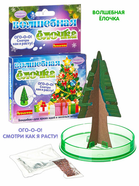 Что растет на елке? Шишки да иголки. А на волшебной елочке серии Ручная работа от Bondibon ребенок сможет самостоятельно вырастить кристаллы! В наборе есть все, что нужно для проведения увлекательного эксперимента! Соедините 2 части каркаса и установите елочку на подставку. Нанесите на дерево раствор для кристаллизации. Когда елочка покроется снегом, украсьте ее блестками из набора. В результате у Вас получится красивая поделка для дома или для конкурса в школе. А еще необычный сувенир можно подарить близким на Новый год. Работая с набором для опытов, дети разовьют зрительное восприятие, внимание, познавательные способности и интерес к химии. В набор входят: бумажный каркас из двух частей, пластиковая подставка, реагент для выращивания кристаллов, блестки. Возраст 5+ Набор для выращивания кристаллов волшебная елочка от Бондибон – занимательный подарок для ребенка на Новый год! Интерактивные развивающие развлечения, большие оригинальный сборные фигурки и пластиковый конструктор – популярные детские игрушки для мальчиков и девочек. Интересные умные развивашки позволят отлично провести новогодний вечер в год дракона и помогут ребенку освоить множество полезны навыков. Маленькие и большие дети с удовольствием поддержат крутые научные игры. Модель конструктор игрушечная кристаллическая ель – отличное дополнение в подарочный набор на новый год.