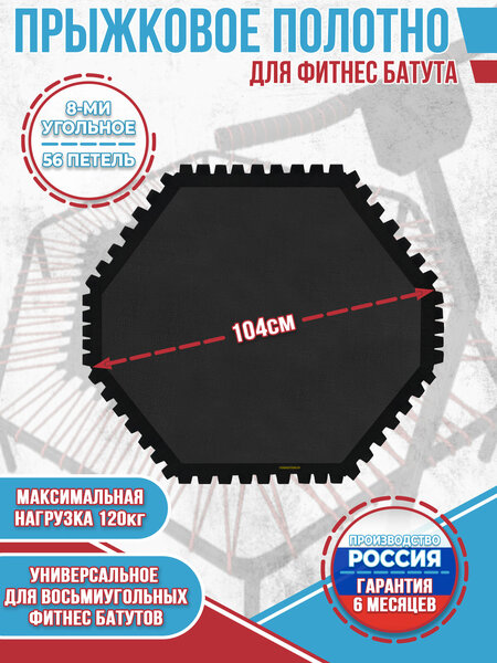 Полотно для фитнес-батутов 8-ми угольное подойдёт для большинства каркасов за счёт крепления с помощью эспандера. Материал Permatron сверхпрочный и износостойкий. Идеально подходит для безопасных и высоких прыжков на батуте. Имеет плотность 260гр/м. Устойчив к воздействию влаги и солнца. Выдерживает перепады температур. Можно использовать в помещении и на улице. Подходит для занятия всеми видами фитнеса на батуте. Всего 56 петель, выступ петли 2см, общий вес 0.5кг. Подробные габариты указаны в инфографике. Максимальная нагрузка – 120кг. При пошиве используется высокопрочная парашютная стропа. Производится в России, высокое и надежное качество пошива. Гарантия на изделие 6 месяцев!