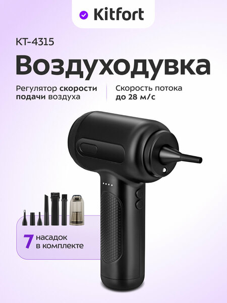 Удобно, быстро, полезно Воздуходувка КТ-4315 - идеальный инструмент для чистки системных блоков, клавиатур и ноутбуков. Компактные размеры, небольшой вес и работа от аккумулятора делают воздуходувку удобной для использования в различных местах. Универсальное применение Основные способы использования воздуходувки: чистка электронной техники, которая очень любит собирать пыль. При помощи воздуходувки также можно надуть игрушки, матрасы и т. д. Прибор также превращается в пылесос и может собрать пыль или крошки со стола. Простое управление Кнопка «Вкл/Выкл» переключает мощность работы воздуходувки. Всего у прибора 3 мощности работы, которые переключаются циклически: скорость потока воздуха 20 м/с, 24 м/с и 28 м/с. Индикаторы заряда упрощают использование прибора. Конструкция «2 в 1» Прибор можно использовать как ручной пылесос, для этого в комплекте есть насадка-пылесборник. Подойдет для очистки, например, рабочего стола или салона авто. Также есть плоская насадка-щётка для уборки более сложных поверхностей. В любой ситуации! В комплекте идут: универсальная насадка, насадка-щётка, насадка-концентратор, насадки для накачки мелких и крупных надувных изделий, узкая насадка, плоская насадка-щётка и насадка-пылесборник. Для безопасной работы Насадка-пылесборник оснащена обратным клапаном, а также блоком фильтров, обеспечивающим дополнительную, более надежную защиту от попадания пыли обратно в воздух. Блок фильтров состоит из фильтров тонкой и грубой очистки. Для уборки в любое время дня Прибор оснащён подсветкой, благодаря которой удобно убираться даже в темных местах. Кнопка «Подсветка» включает и выключает подсветку. Беспроводная работа Прибор заряжается от провода в комплекте и работает без проводов. Время работы прибора на первой мощности – до 35 минут. Время зарядки 4,5 часа.