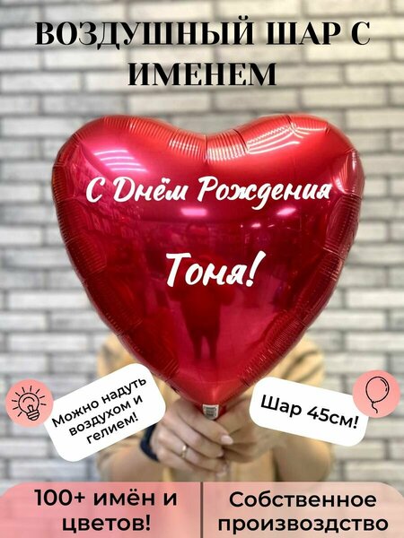 Фольгированное сердце красного цвета с надписью «С днём рождения, Тоня!» Эффектное и стильное украшение для любого праздника. Шар в форме сердца изготовлен из качественной фольги, которая обеспечивает ему долговечность и яркость. Размер сердца — 45 см. Оно станет заметным и привлекательным элементом декора. Красный цвет добавит яркости и энергии любому торжеству. Шар можно наполнить гелием, тогда он будет летать под потолком, или просто надуть воздухом и поставить на стол или полку. Это прекрасный способ поздравить именинницу с днём рождения или просто порадовать её красивым и необычным подарком.