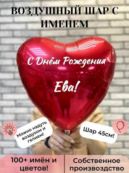 Фольгированное сердце красного цвета с надписью «С днём рождения, Ева!» Эффектное и стильное украшение для любого праздника. Шар в форме сердца изготовлен из качественной фольги, которая обеспечивает ему долговечность и яркость. Размер сердца — 45 см. Оно станет заметным и привлекательным элементом декора. Красный цвет добавит яркости и энергии любому торжеству. Шар можно наполнить гелием, тогда он будет летать под потолком, или просто надуть воздухом и поставить на стол или полку. Это прекрасный способ поздравить именинницу с днём рождения или просто порадовать её красивым и необычным подарком.