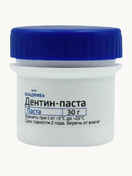 Материал Дентин-паста - цинковая паста (цинк-сульфатный цемент) на полимерной основе и представляет собой готовую к применению однородную пасту, отверждающуюся под воздействием влаги полости рта, применяется как временная пломба для лечения зуба. Стоматологический материал Дентин паста отверждается под воздействием влаги в течение 2-3х часов, в процессе затвердевания материал расширяется, обеспечивая плотное краевое прилегание. Дентин-паста обладает высокой устойчивостью к нагрузкам и превосходной адгезией к твердым тканям зуба, не вызывает раздражения тканей полости рта. Дентин паста предназначена для профессионального применения в стоматологии. Перед применением необходимо ознакомиться с инструкцией, которая расположена в данной карточке продукта - фото №3. В зависимости от партии (на усмотрение производителя) на баночке может отсутствовать мембрана (фольга), что никак не влияет на свойства пасты.