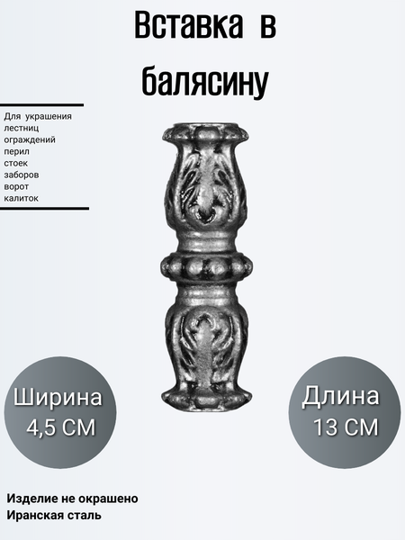 Иранский кованый элемент — это великолепное произведение искусства, сочетающее в себе изящество и уникальность. Внимание к мельчайшим деталям делают каждый элемент уникальным и неповторимым. Кованые элементы иранского производства известны безупречным качеством и прекрасным исполнением. Кованые элементы часто используются для украшения интерьера, придавая ему особый шарм и элегантность. Они могут стать изюминкой в декоре или служить как акцентная деталь. Благодаря их уникальному дизайну и изысканности, они способны привнести дух восточного роскошества в любое помещение. Изделие не окрашено, из-за чего рекомендуется хранить их в сухом помещении. Редко могут иметь незначительные следы локальной коррозии. Это не является браком или дефектом, так как не влияет на их потребительские свойства, а дальнейшее их использование в конструкциях лестниц и ограждений, предполагает их подготовку, монтаж, грунтовку и покраску. Технические характеристики элемента могут незначительно отличаться от заявленного.