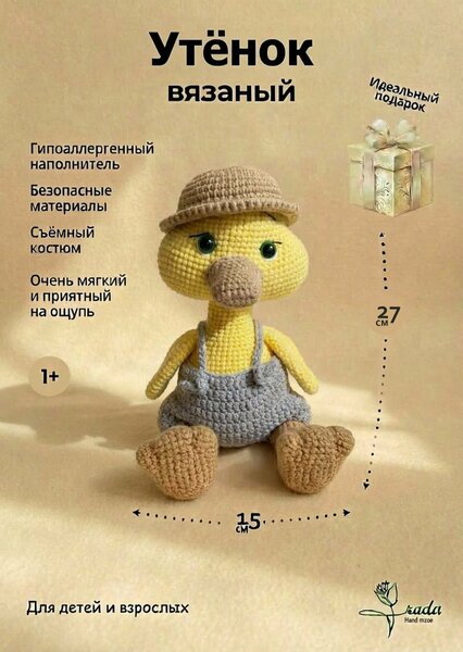 Вязаный утёнок — идеальный подарок для детей и взрослых Этот очаровательный вязаный утёнок — отличный подарок на любой случай! Он изготовлен из безопасных и гипоаллергенных материалов, что делает его абсолютно безопасным для детей от 1 года. Мягкий, приятный на ощупь и с милыми деталями, он станет настоящим другом для вашего малыша или оригинальным украшением интерьера для взрослого. Особенности: Гипоаллергенный наполнитель: безопасен для детей и взрослых, не вызывает аллергии. Безопасные материалы: все используемые материалы прошли тщательную проверку. ✅ Съёмный костюм: удобен в уходе, утёнка легко переодевать. Очень мягкий и приятный на ощупь: идеально подходит для объятий. Размер: высота 27 см, ширина 15 см — идеален для игры и декора. Подходит для детей и взрослых: благодаря универсальности, утёнок понравится для игр, декора или коллекции.