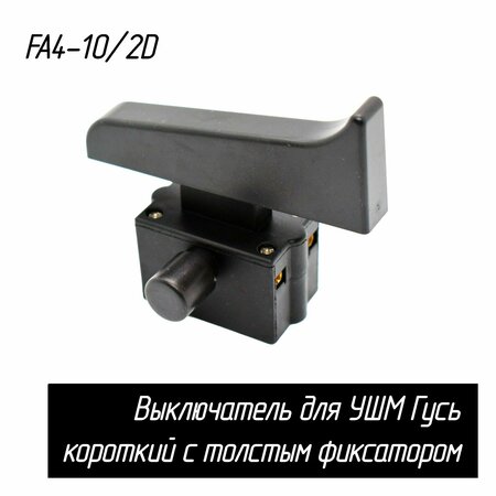 Выключатель для УШМ клавиша Гусь короткий с толстым фиксатором. Обозначение: FA4-10/2D 10(10)A 220V~ 20(20)A 110V~. симальное напряжение - 220 В. симальный ток - 10 А. Диаметр кнопки-фиксатора - 12 мм. Длина клавишы - 75 мм.