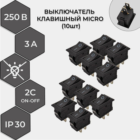 Выключатель клавишный 250V 3А (2с) ON-OFF черный Micro предназначен для коммутации электрических цепей переменного тока напряжением до 250В. Клавишные (Рокерные) выключатели применяются в качестве комплектующих изделий различного электрооборудования (в сетевых фильтрах и удлинителях, аудио-оборудовании, блоках питания, электроустановках на различных производствах, автомобилях, и многих других местах). Такой клавишный переключатель имеет два положения. Принцип действия основан на перемещении клавиши в одну из позиций. Для переключения в нужное положение требуется приложить некоторые усилия на клавишу. Монтаж осуществляется без применения винтов на плоских панелях толщиной от 0.8мм до 3мм. Подключение контактов осуществляется плоской клеммой, либо с помощью пайки. Основные характеристики: Номинальное напряжение: 250В; Предельное напряжение: 1500VАС не более 1 минуты; Номинальный ток: 3A (250VAC); Контактное сопротивление: не более 35 мОм; Тип переключения: ON-OFF; Количество контактных групп: 1; Количество контактов в контактной группе: 2; Фиксация положения: да; Индикация коммутационных положений: нет. Рабочая температура: от -25 до 85; Ресурс: 10 000 циклов.
