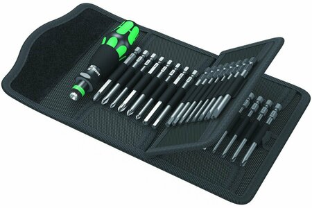 Набор бит KRAFTFORM KOMPAKT 62 WERA WE-059297 включает 33 предмета, с помощью которых можно выполнять задачи по монтажу/демонтажу различного крепежа: шурупов, саморезов, винтов, болтов. Ручка-держатель оснащена системой Rapidaptor для быстрой установки и быстрого извлечения насадок, быстрого вращения и возможностью управления одной рукой. Её конструкция исключает перекатывание по рабочей поверхности. Набор поставляется в удобной поясной сумке, благодаря чему инструмент находится всегда под рукой. Количество насадок в наборе: 32 шт. Трещоточный механизм: нет. Намагниченный наконечник: нет. Ударная: нет. Для точных работ: нет. Общая длина: 160 мм. Длина стержня: 89 мм. Материал рукояти: 2-х компонентный. Диэлектрическое покрытие: нет. Форма ручки: Прямая. Гибкая: нет. Вес нетто: 0.8 кг. Габариты без упаковки: 1296000 мм. Материал насадок: CrV. Тип шлица: Sl, Ph, Torx, Hex, Pz. Комплектация: Ручка-держатель длиной 119 мм с быстрозажимным патроном 1/4" , Биты PH1, PH2, PH3, Биты PZ1, PZ2, PZ3, Бита SL 6.5, Биты TORX с отверстием TX8, TX10, TX15, TX20, TX25, TX27, TX30, TX40, Биты Spanner 4, 6, 8, 10, Биты Hex с отверстием 2, 2.5, 3, 4, 5, 6, Биты Torg-set 6, 8, 10, Биты Tri-wing 1, 2, 3, 4.
