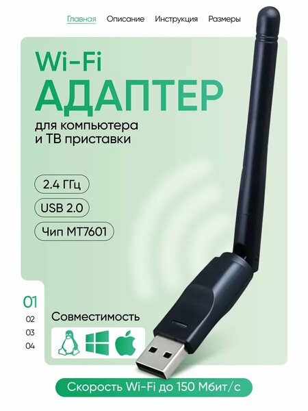 USB Wi-Fi адаптер для компьютера и ТВ приставки, чип MT7601, совместимость с Windows и Linux