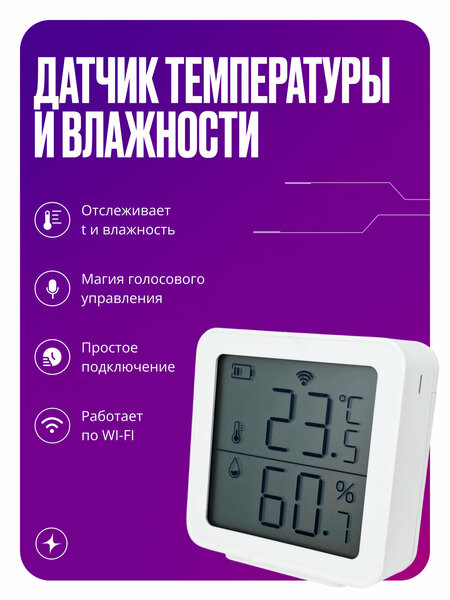 Умный датчик температуры и влажности воздуха – ваш надежный помощник для создания идеального микроклимата. Этот комнатный гигрометр с термометром обеспечивает точный контроль за климатическими условиями в помещении. Он легко интегрируется с Яндекс Станцией и голосовым помощником Алиса, а подключение к Wi-Fi позволяет управлять микроклиматом не вставая с дивана. Четкий ЖК-экран отображает все ключевые параметры в реальном времени. Основные функции: - Точные измерения – определяет температуру и влажность с минимальной погрешностью. - Прямое подключение – работает через Wi-Fi без дополнительных модулей. - Умная автоматизация – совместим с розетками и другими устройствами экосистемы. - Информативный дисплей – показывает температуру, влажность, уровень заряда и статус соединения. - Долгая работа – питается от 3 батареек АА (продаются отдельно). Где будет полезен: - Дом и квартира – контроль климата в спальне, детской, кухне. - Офис – поддержание комфортных условий для сотрудников. - Теплица – мониторинг влажности и температуры для растений. - Ванная – защита от сырости и плесени. Простая установка: 1. Вставьте 3 батарейки АА. 2. Подключите датчик к Wi-Fi через приложение Digma или Smart Life. 3. Добавьте устройство в Алису. Это не просто измеритель, а персональная метеостанция для вашего дома! С этим датчиком вы всегда будете в курсе климатических условий и сможете легко их регулировать для максимального комфорта.