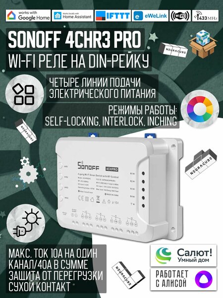 SONOFF 4CH Pro R3 — 4-канальный Wi-Fi + RF (433 МГц) умный переключатель Управляйте 4 устройствами одновременно с гибкой настройкой режимов работы и поддержкой как Wi-Fi, так и RF-пультов (433 МГц). Идеальное решение для освещения, штор, ворот, насосов и других систем автоматизации. Описание продукта: SONOFF 4CH Pro R3 — современное решение для умного дома: