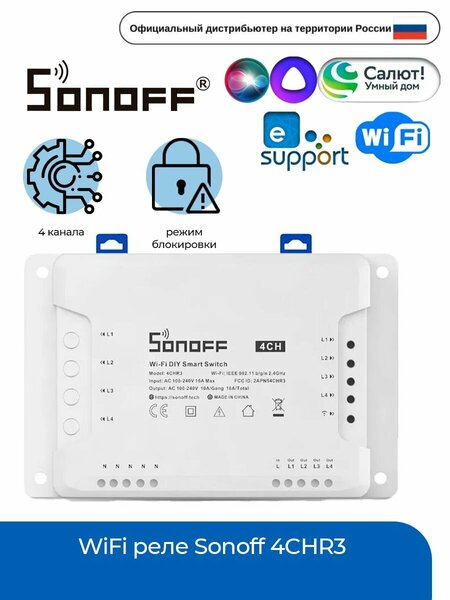 "Sonoff 4CH R3" это 4-канальное реле с креплением на DIN-рейку. По функционалу схоже с Sonoff Basic, отличается от него наличием 4х каналов вместо одного и наличием установки на дин рейку. 4 независимых канала, функция крепления на DIN-рейку, поддержка Wifi, Поддержка 8 таймеров - включение/выключение по заданному алгоритму, Управление неограниченным количеством WiFi реле с одного смартфона, Можно управлять одним устройством Sonoff с разных смартфонов, Бесплатное русскоязычное приложение Ewelink на Android и на IOS. Настройка Sonoff простая, в приложении Ewelink подробно описаны шаги. Голосовое управление с помощью Алиса, Google Home, Amazon Alexa
